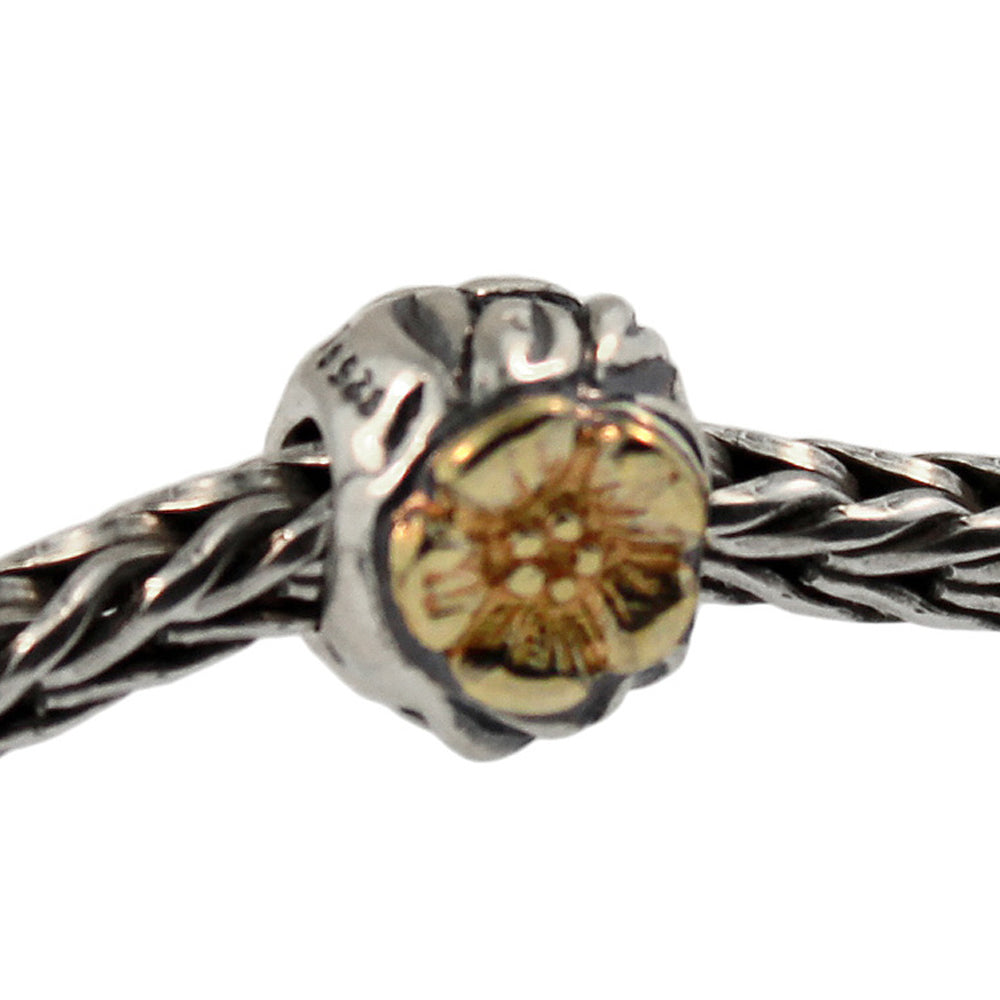 Two gold flowers in silver leaves.